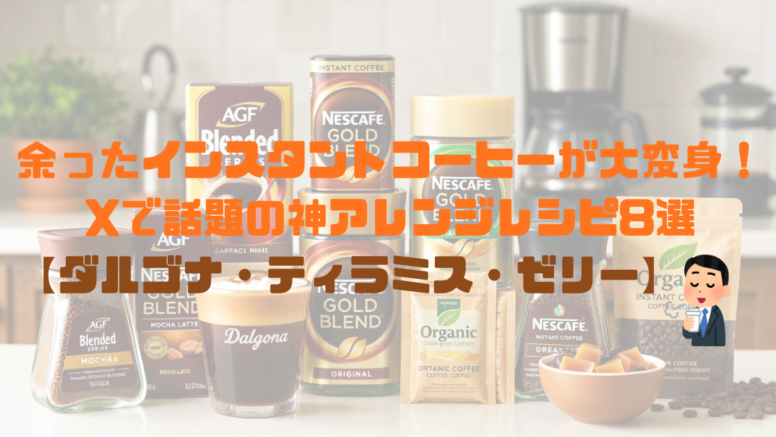 グルメ 余ったインスタントコーヒーが大変身!Xで話題の神アレンジレシピ8選【ダルゴナ・ティラミス・ゼリー】 余ったインスタントコーヒーを有効活用!Xで話題のネスカフェ・AGF・オーガニックおすすめと、ダルゴナコーヒー・コーヒーゼリー・ティラミスなど簡単神アレンジレシピ8選を紹介。2026年最新のおうちカフェ術! 2026.01.02 2026.01.07 グルメ