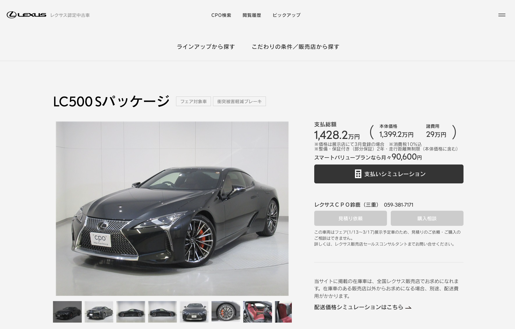 この個体はLC500 “S package” 支払総額は約1,428万円、本体価格は1,399万円と表示されています。