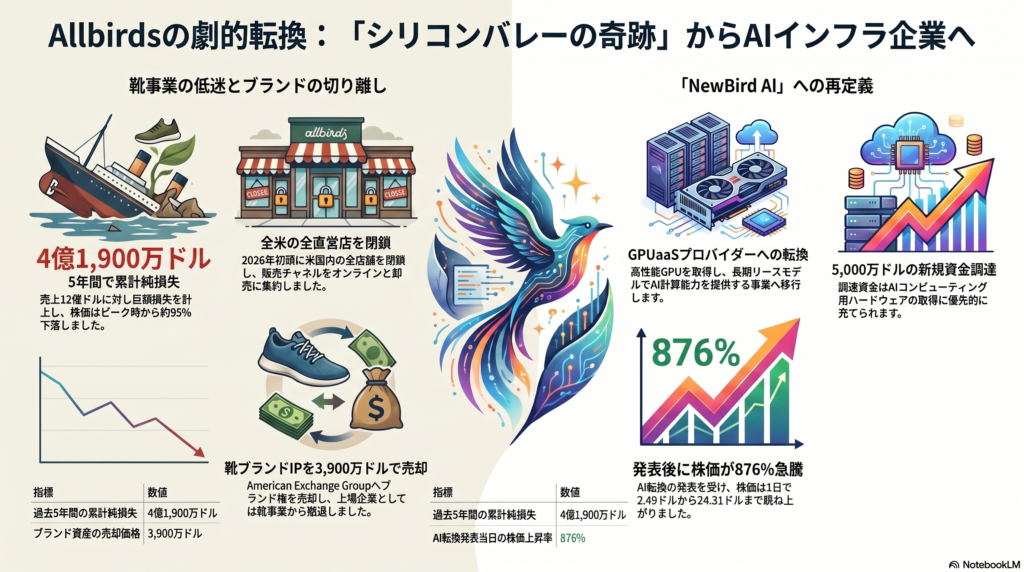 - 上場企業(旧Allbirds / 新NewBird AI)は靴の販売から完全撤退。