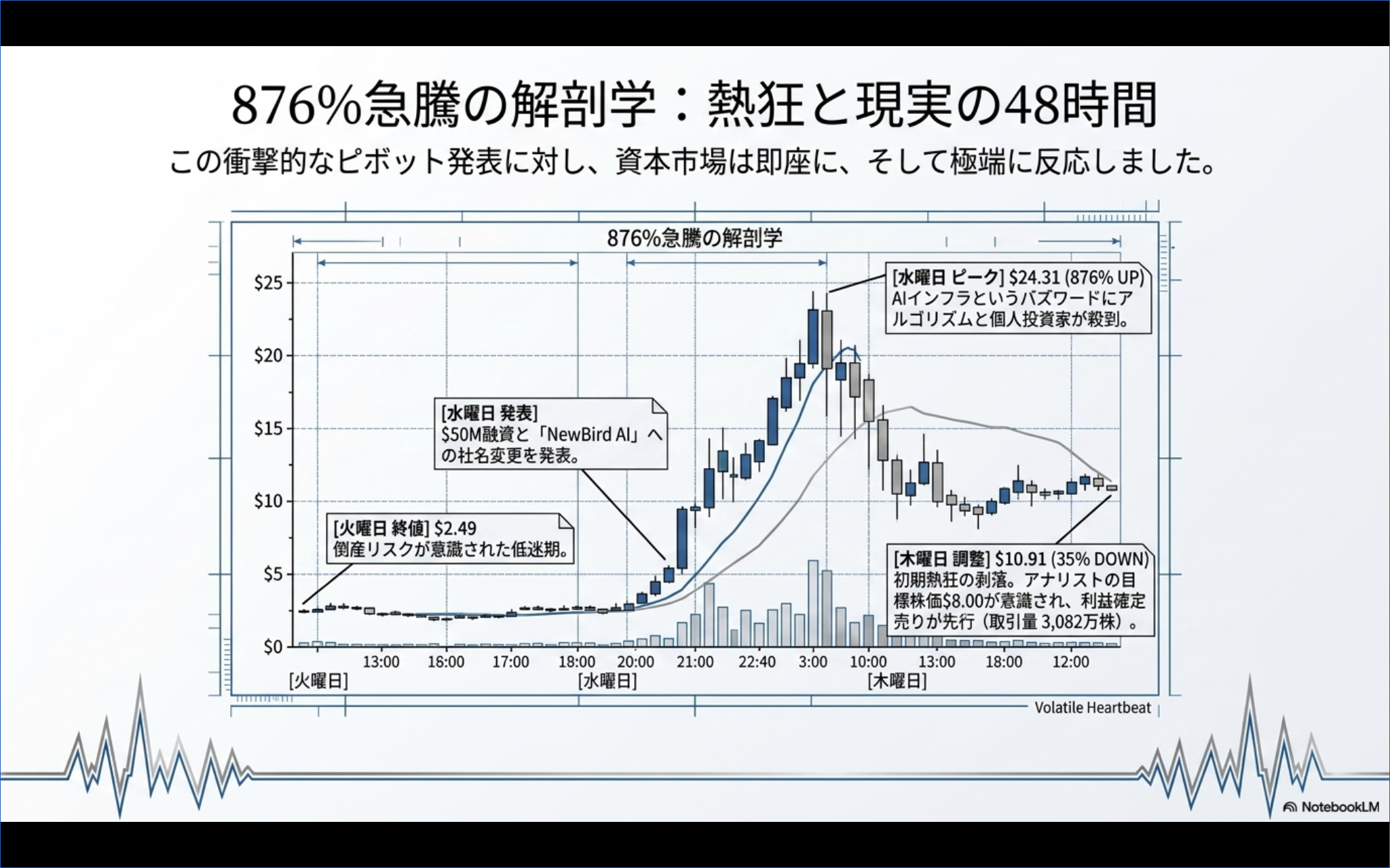 | 4/15(水)ピーク | $24.31(+876%) | AI銘柄として投機買い殺到 |