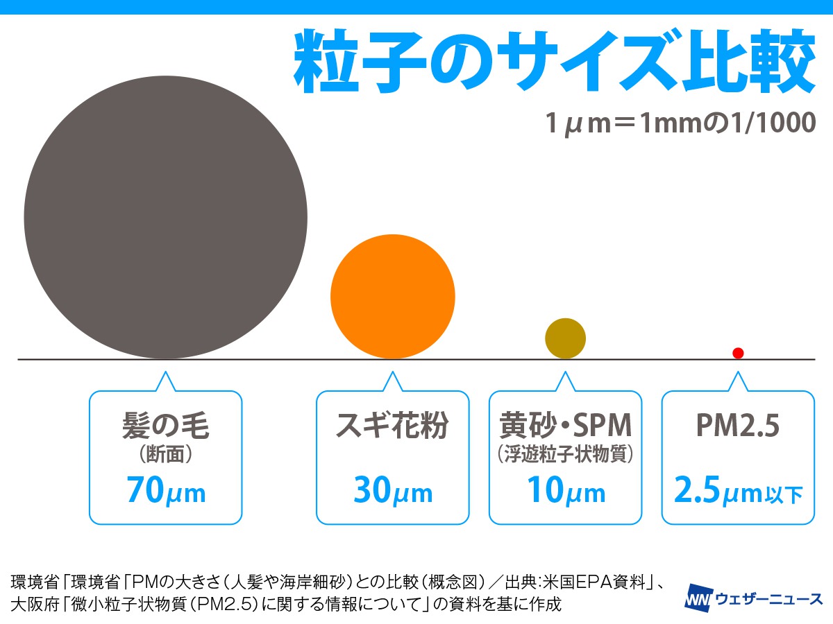 PM2.5とは、直径2.5マイクロメートル以下の極めて小さい粒子状物質の総称です。